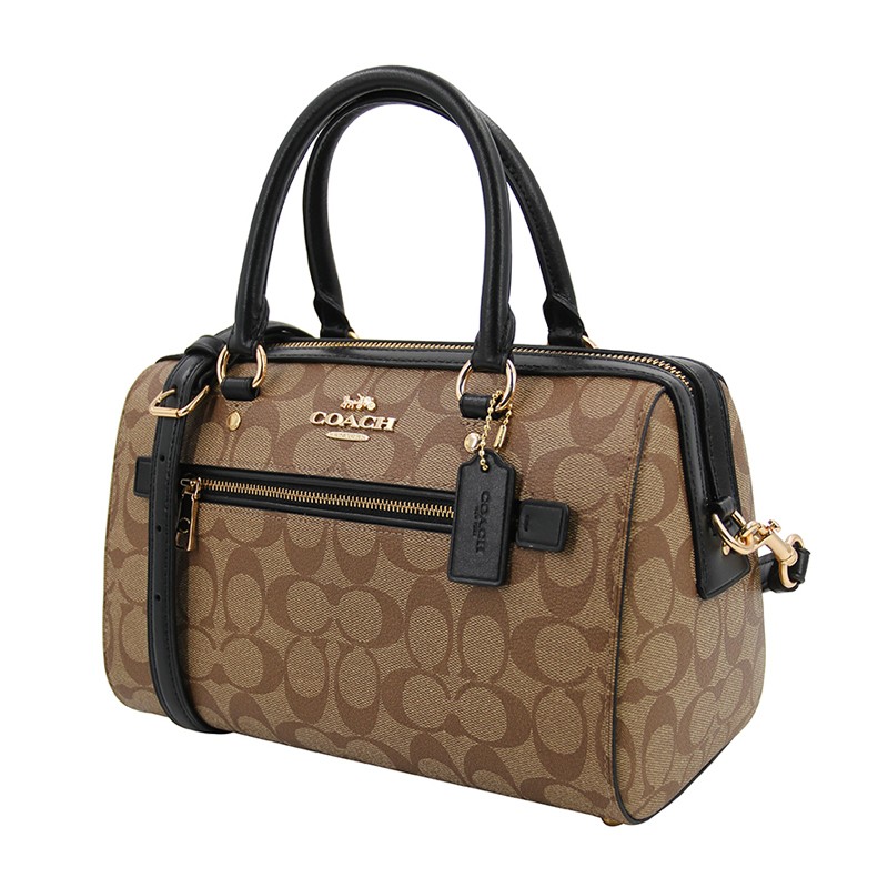 送女友蔻驰COACH奢侈品女士中号波士顿包手提肩背斜挎浅棕黑边PVCF83607IMCBI