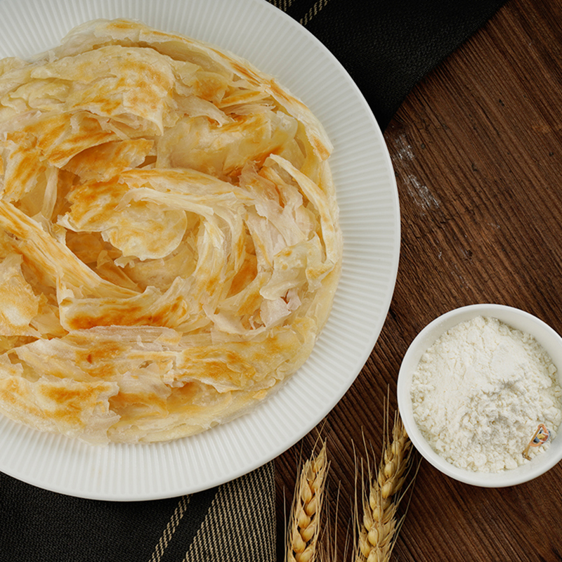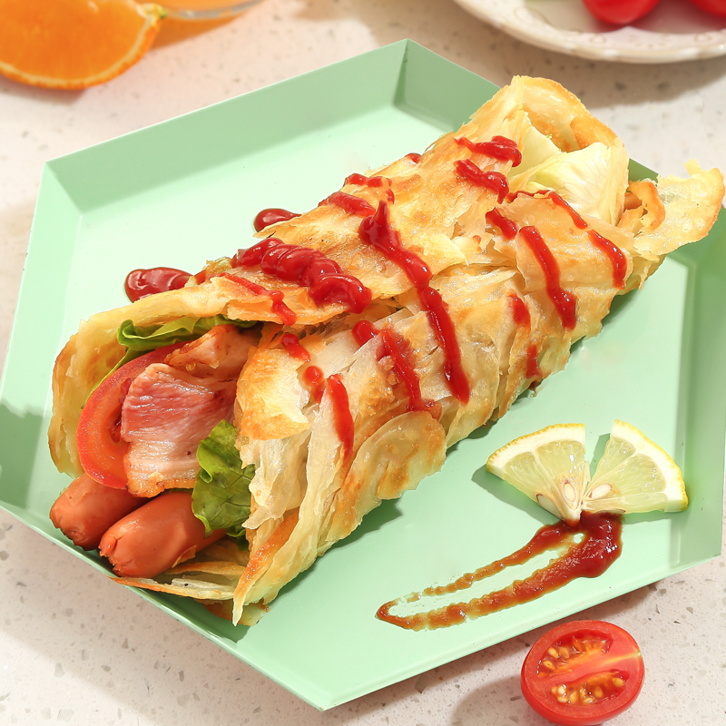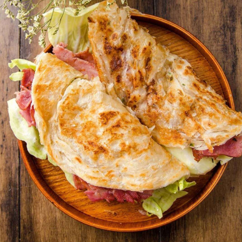 正宗台湾手抓饼,采用高品质小麦粉,揉入鲜美香葱,反复压延,成就好手抓饼,三分钟即食,简单易操作,外焦里嫩,松脆可口,营养又美味!没有什么是一张手抓饼解决不了的,如果有那就再来一张!抓饼是从葱抓饼演变而来,起源于中国台湾地区。2004年在台湾夜市被发现并于2005年正式从台湾引进至内地。新鲜出炉后的手抓饼,千层百叠,层如薄纸,用手抓之,面丝千连,其外层金黄酥脆,内层柔软白嫩,一股葱油与面筋的香味扑鼻而来,让每位食客来不及等待,抓起就吃。手抓饼至今一直风靡全国,可搭配鸡蛋、猪肉叉烧、牛肉饼、粮心香肠、藤椒鸡排、培根、方火腿、鸡柳、蔬菜等辅料,也可搭配酱爆汁、孜然香辣酱、番茄沙司、麻辣汁、甜辣酱、甜味沙拉酱、黑椒酱、排骨酱等酱料,香酥可口,老少皆宜。