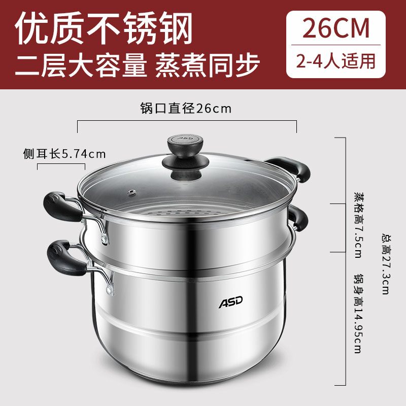 爱仕达 ASD 蒸锅不锈钢锅双层蒸锅蒸馒头锅煲汤锅蒸笼26CM电磁炉燃气通用锅具QVL1526(WG)