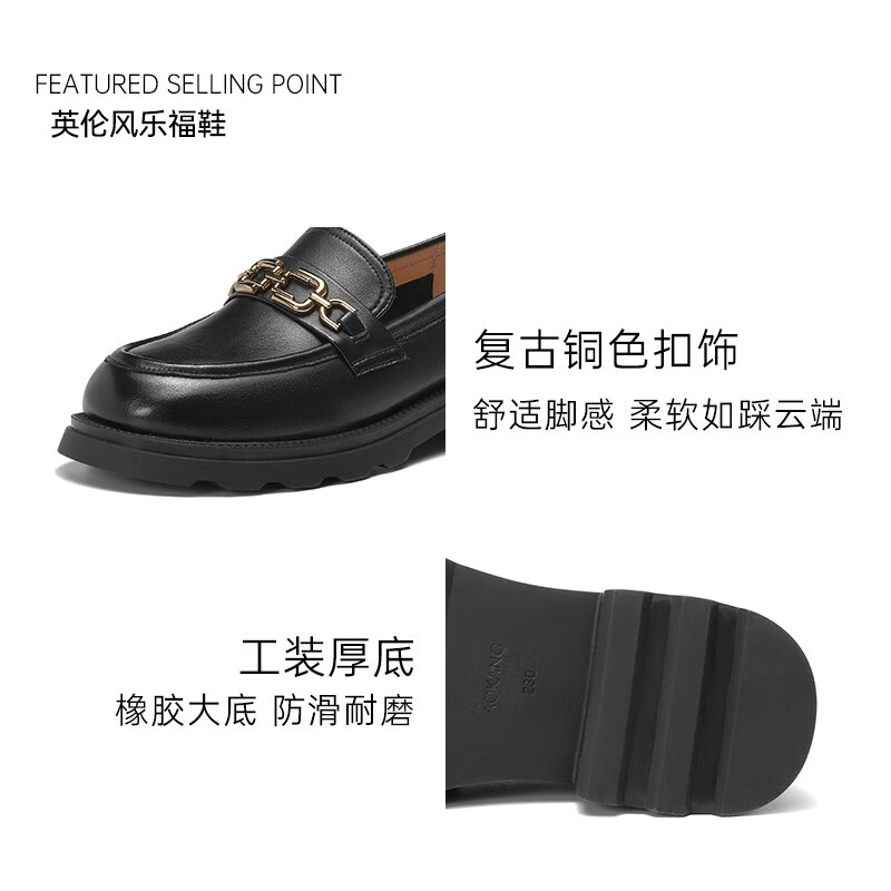 AOKANG 奥康 女士英伦风乐福鞋 N1224314079,圆头设计,外围加宽,猪皮鞋垫,舒适透气,鞋底凹槽底纹,耐磨防滑。 阅读全文 -