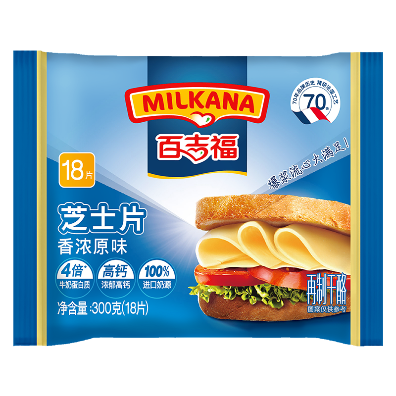 百吉福(MILKANA) 芝士片 再制奶酪 原味 300g/18片装 冷藏 即食 早餐烘焙原料
