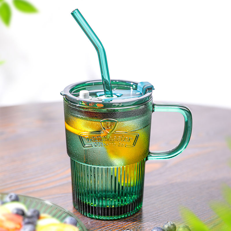 乐唯诗 墨绿带把玻璃水杯大容量原色玻璃ins风吸管杯一盖两用啤酒咖啡杯 兰特杯【吸管杯*2】