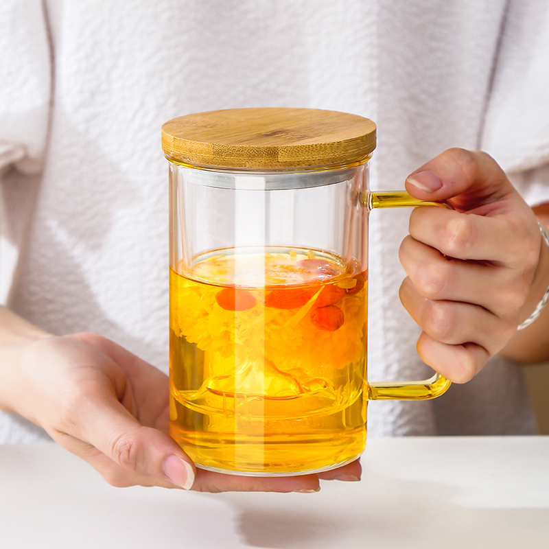 唯铭诺 耐高温茶具家用水杯 内胆过滤茶水分离玻璃杯办公室竹盖茶杯 观山竹盖茶杯435ml