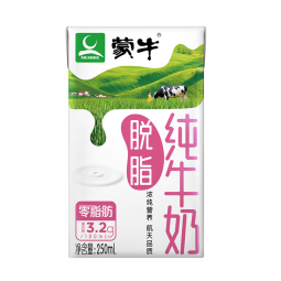 蒙牛是蒙牛集团旗下主力品牌,于1999年成立,总部位于中国内蒙。蒙牛品牌主打液体奶、冰激凌和其他乳制品等产品。蒙牛旗下有特仑苏、未来星、焕轻、优益C、冠益乳、酸酸乳及纯甄等品牌。这款脱脂型纯牛奶,规格:250ml*24盒*2箱。 阅读全文 -