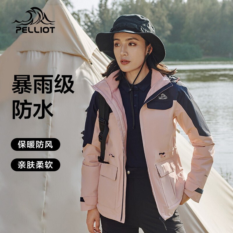 伯希和三合一冲锋衣女佟丽娅同款可拆卸抓绒内胆防风保暖多功能拼接外套 樱花粉M PE212040106