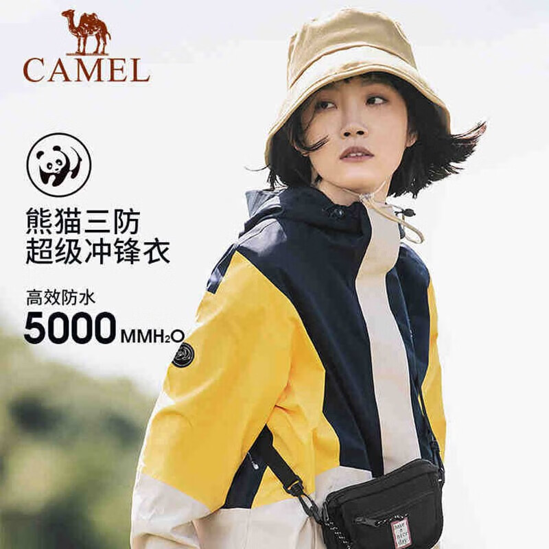 [丁真同款]【熊猫系列】骆驼三防冲锋衣女单层外套户外防水西藏旅游登山服装 AA22235457,暮蓝/姜黄/燕麦灰,女 XL