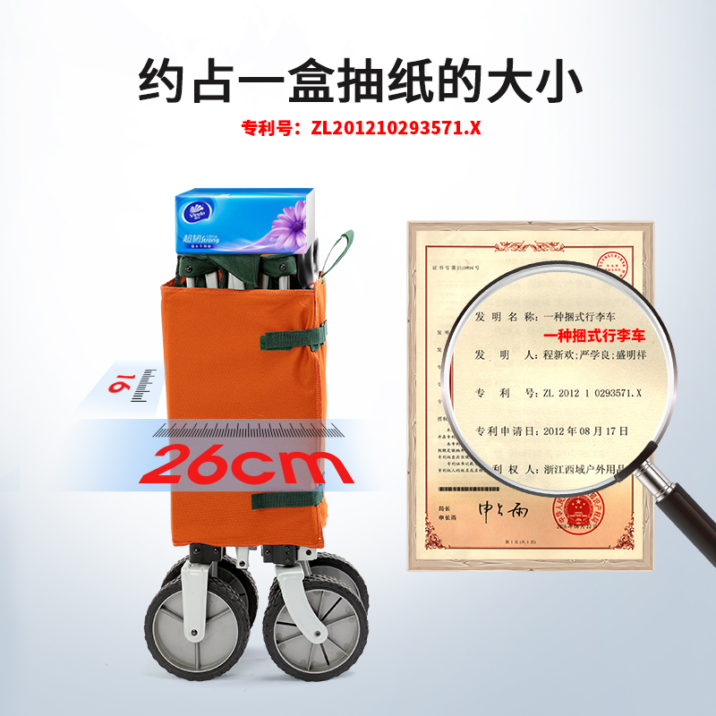 捆式收折,收折体积跟抽纸一样大,可伸长把手更省力,加厚加粗框架,承重更好,600D牛津布面料,耐磨耐用 ,90*47*30大尺寸,三个帐篷,四把椅子轻松放。 阅读全文