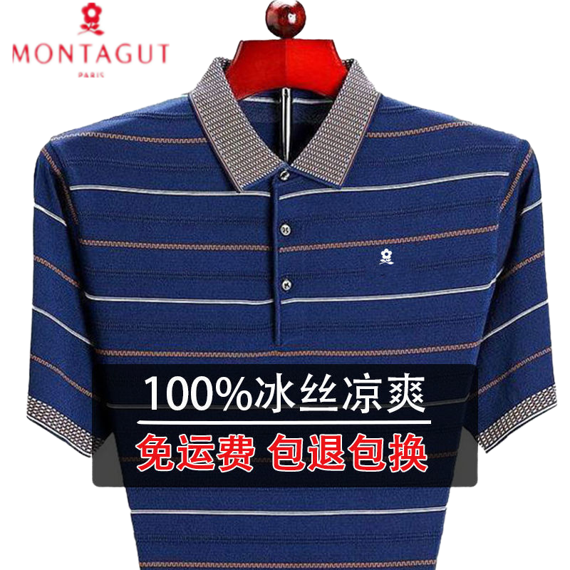 梦特娇(MONTAGUT)轻奢高档男装短袖T恤夏季中年凉爽体恤宽松大码冰丝爸爸装针织衫 蓝色 185/100A 建议170-190