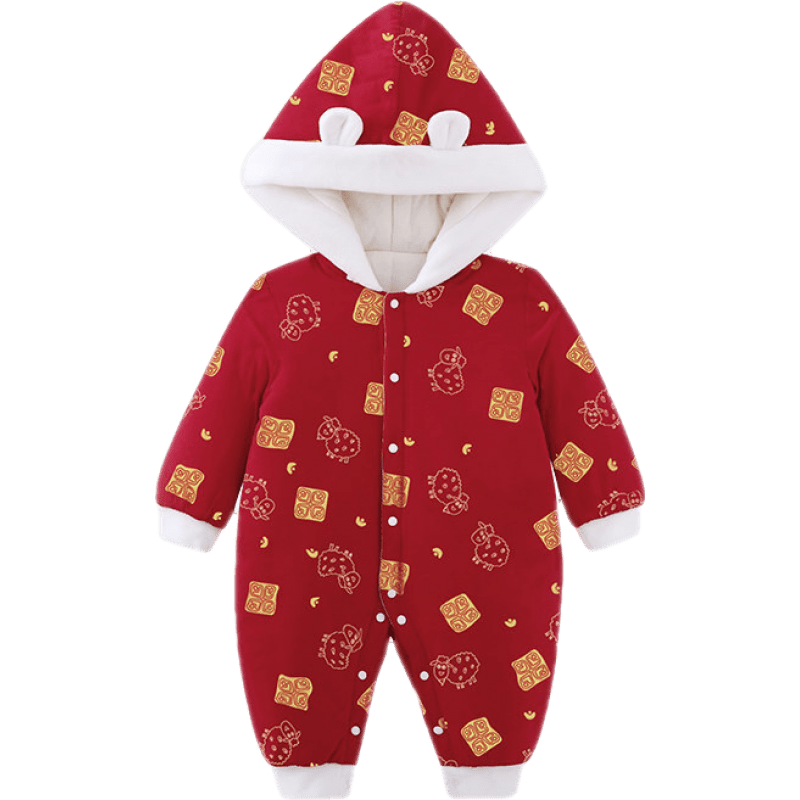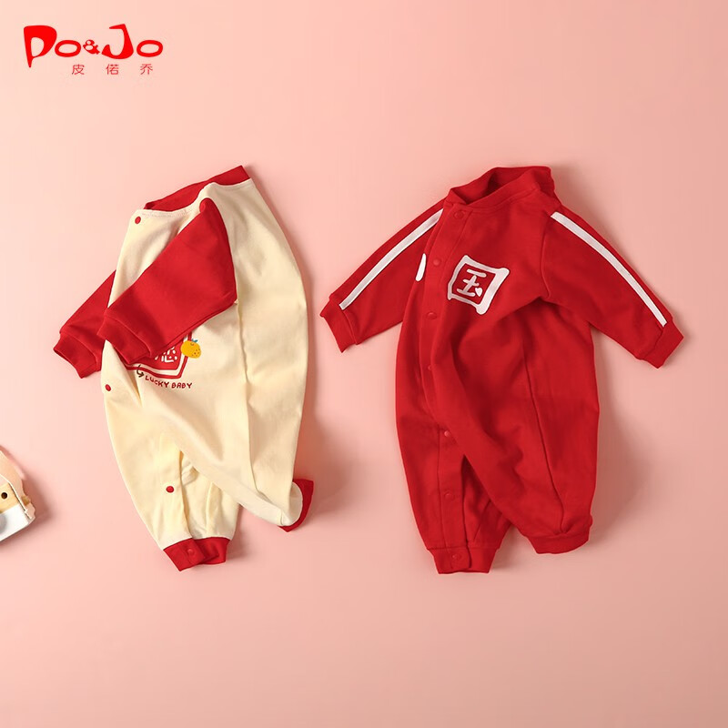 皮偌乔(Po&Jo)皮偌乔婴儿连体衣0-3岁宝宝纯棉保暖衣服新生儿秋冬装红色拜年服 中国风-红色 73cm
