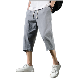 月伊纺 夏季溥款宽松直筒休闲裤男士百搭大码棉麻七分裤青年韩版哈伦裤 晴蓝色 M