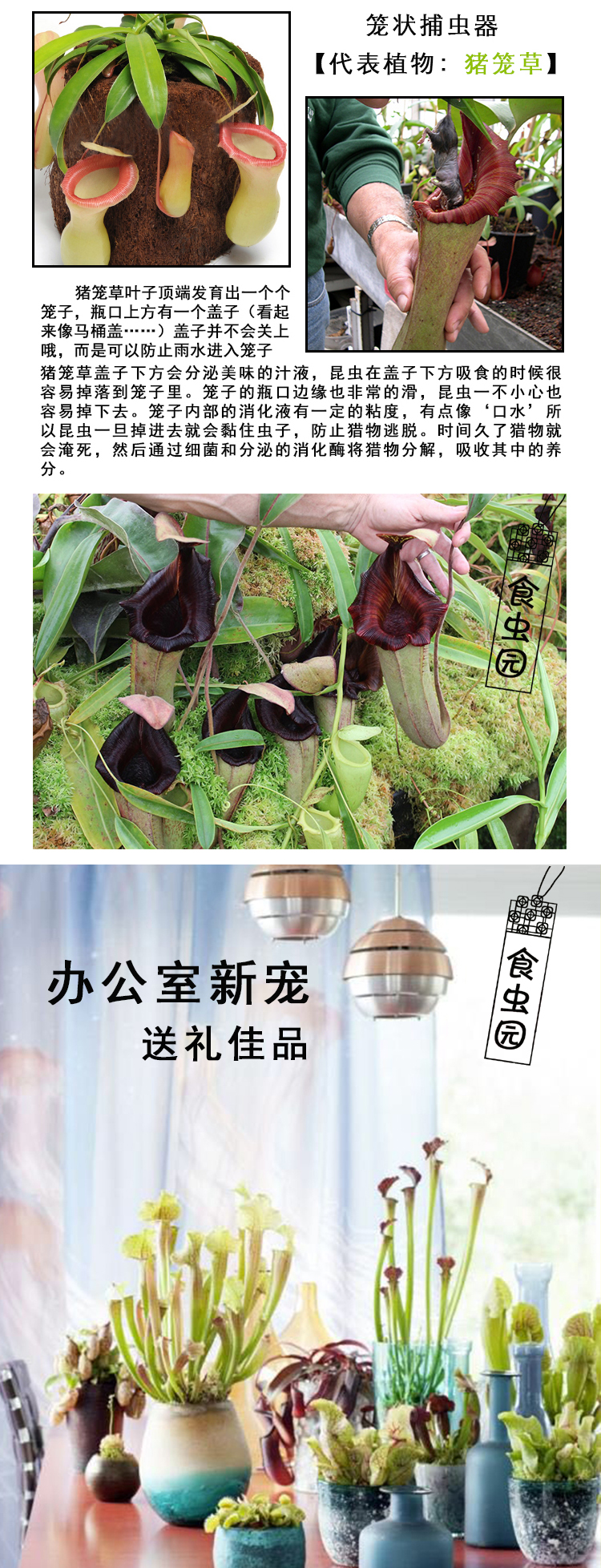 这种能够吸引和捕捉猎物,并能产生消化酶和吸收分解出的营养素的食虫植物分布于10个科约21个属,有630余种。此外,还有超过300多个属的植物具有捕虫功能,但其不具备消化猎物的能力,只能被称之为捕虫植物。某些猪笼草偶尔可以捕食小型哺乳动物或爬行动物,所以食虫植物也称为食肉植物。 阅读全文