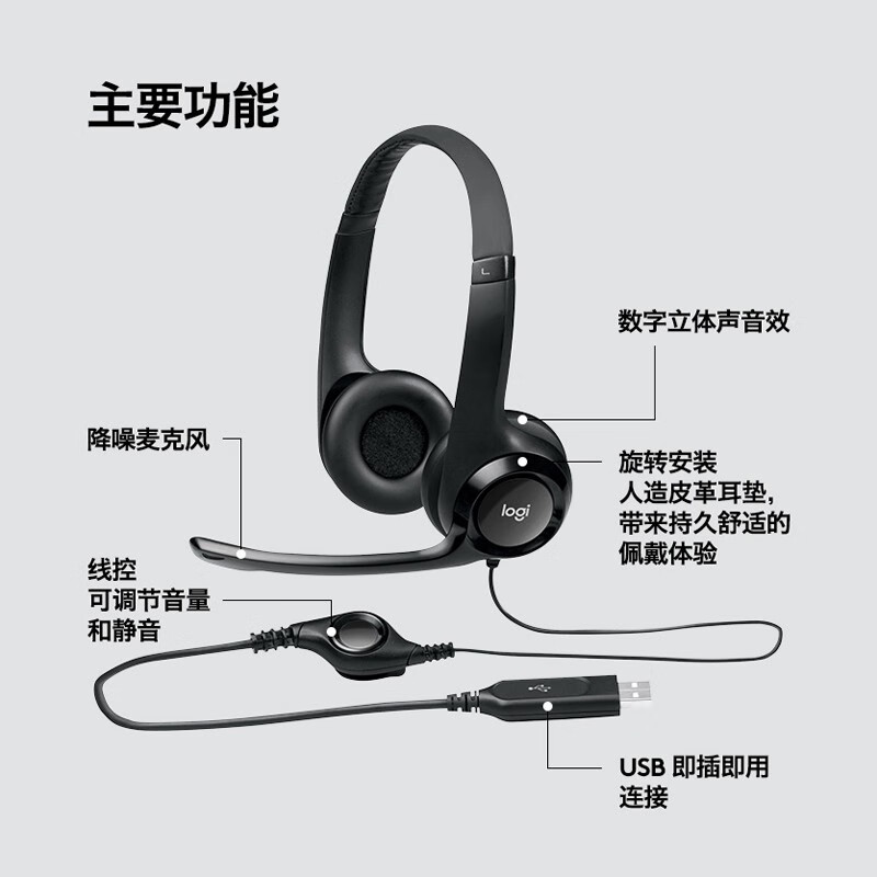 罗技(Logitech) H390头戴式耳机 USB有线带话筒降噪 立体声 培训会议考试 办公 学习 线长233cm