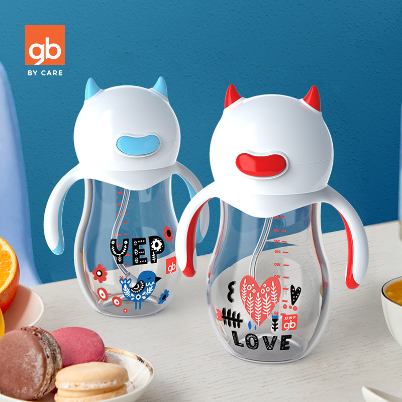 gb好孩子 儿童水杯 宝宝学饮杯 晶透吸管训练杯带握把铜珠240mL-静谧蓝(天使饿魔印花系列)