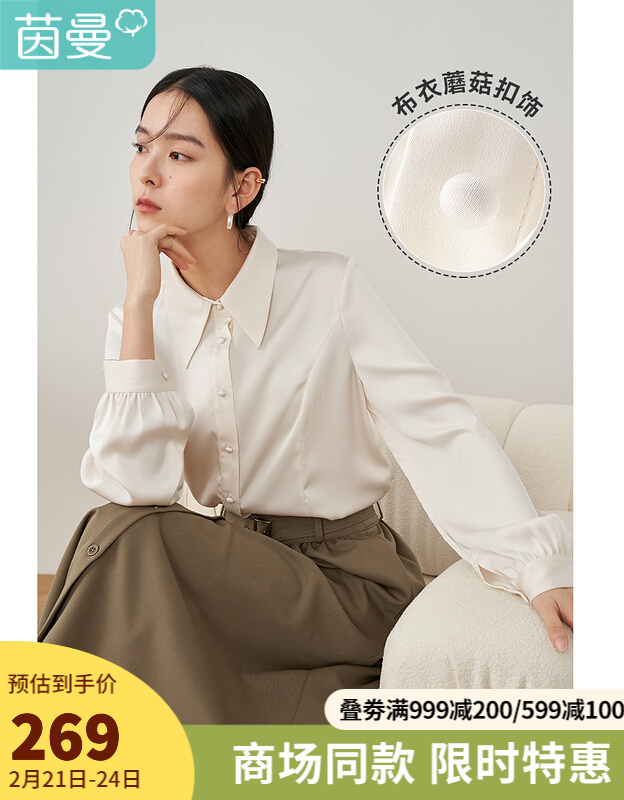 【商场同款】茵曼宽松女2022年春季新款简约通勤翻领百搭缎面衬衫【W18213092】 浅杏色 L