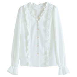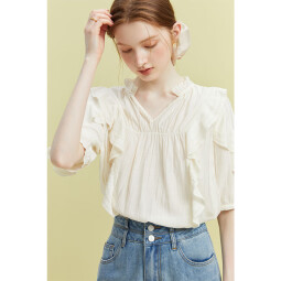 FANSILANEN 范思蓝恩 女士衬衫 23FS12439 木耳边抽皱对丝工艺+V型分割领,修饰脸型,从肩部顺延至衣身和袖子上,有层次不单调。 阅读全文 -