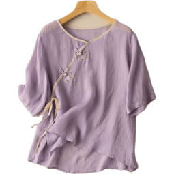 子牧棉麻春夏装 女民族风斜襟盘扣刺绣短袖上衣宽松衬衫0212 紫色 4XL(建议150-160斤)