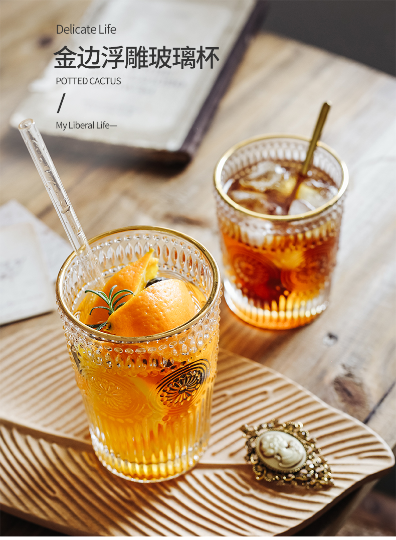 复古风浮雕金边玻璃杯茶叶杯果汁牛奶饮料杯ins笔筒化妆刷桶 8.60元