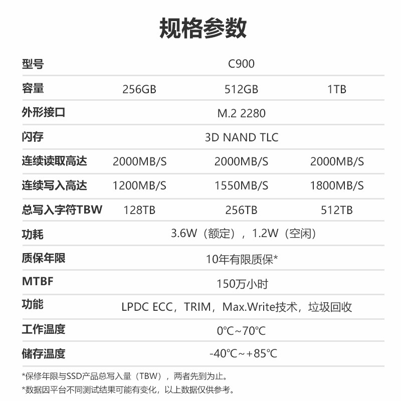 读取速度为7000MB/s,写入速度5700MB/s,高品质3D TLC闪存颗粒。