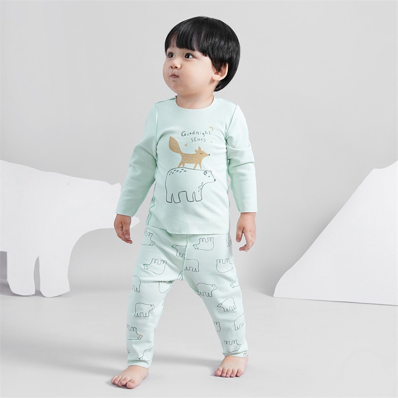 猫人儿童内衣套装秋衣秋裤男童女童纯棉宝宝保暖睡衣大童青少年学生内衣小孩秋季长袖长裤两件套童装 丛林小熊-绿色 100