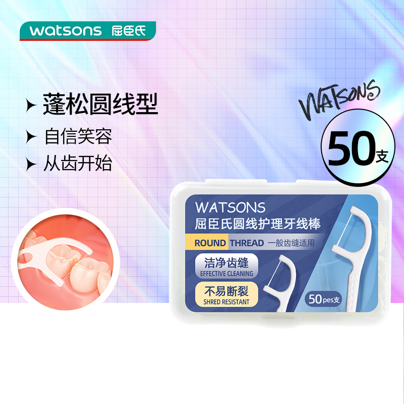 屈臣氏 牙线棒舒适洁齿高分子圆线护理型50支/盒清洁齿缝超细牙线剔牙签