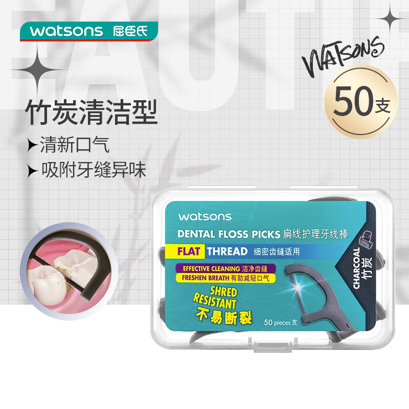 屈臣氏 竹炭扁线护理牙线棒50支 清洁齿缝超细便捷竹炭扁线牙签