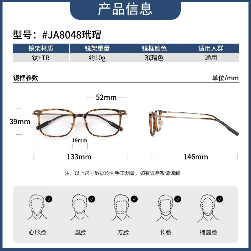 镜邦 近视眼镜超轻防滑黑色眼镜框男方形金丝防蓝光眼镜 JA8048玳瑁色 配万新1.67mr-7防蓝光镜片