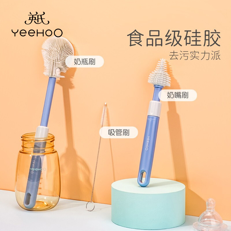 英氏yeehoo奶瓶刷硅胶三合一吸管刷婴儿奶嘴水杯清洗工具长柄便携清洁套装洗杯子神器 尼空蓝