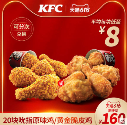 【618】电子券码 肯德基 20块吮指原味鸡/黄金脆皮鸡兑换券 平均每份低至8元!