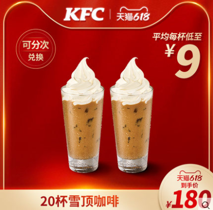 【618】电子券码 肯德基 20杯雪顶咖啡兑换券 平均每杯低至9元!