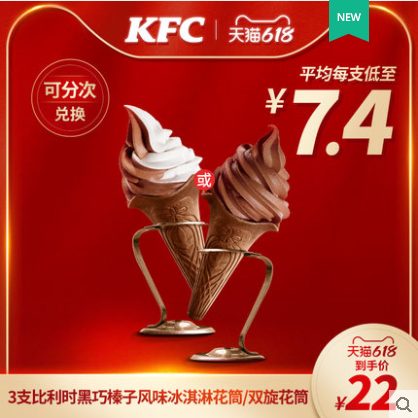 【618】肯德基 3支比利时黑巧榛子风味冰淇淋花筒/双旋花筒兑换券 平均每份低至7.4元!