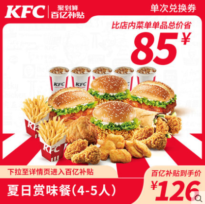 【百亿补贴】电子券码 肯德基 Y504 春日赏味餐(4-5人)兑换券 立省85元!
