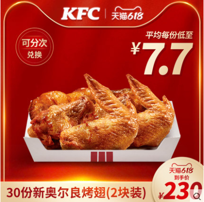 【618】电子券码 肯德基 30份新奥尔良烤翅(2块装)兑换券 平均每份低至7.7元!