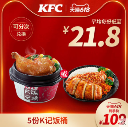 【618】电子券码 肯德基 5份K记饭桶兑换券 平均每份低至21.8元!