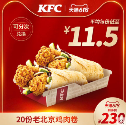 【618】电子券码 肯德基 20份老北京鸡肉卷兑换券 平均每份低至11.5元!
