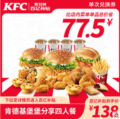 【百亿补贴】电子券码 肯德基 堡堡分享四人餐兑换券 立省77.5元!