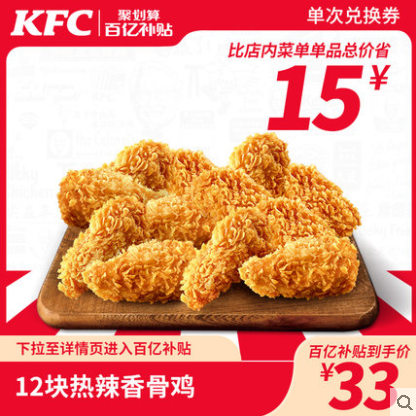 【百亿补贴】电子券码 肯德基 12块热辣香骨鸡兑换券 立省15元!