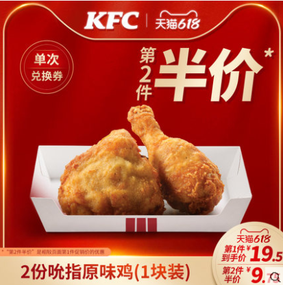 【618】电子券码 肯德基 2份吮指原味鸡(1块装)兑换券 第二件半价!