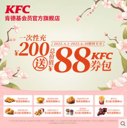 肯德基电子卡200元赠总价值88元KFC券包 200元赠总价值88元KFC券包