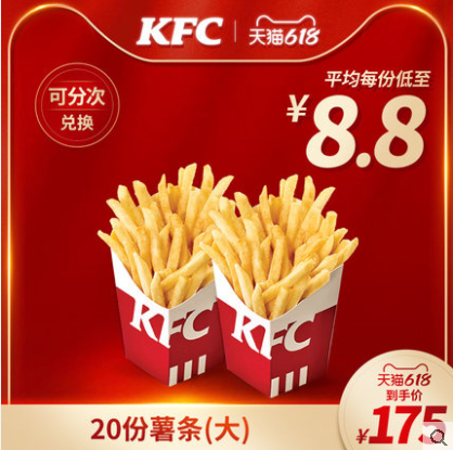 【618】电子券码 肯德基 20份薯条(大)兑换券 平均每份低至8.8元!