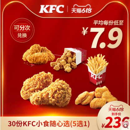 【618】电子券码 肯德基 30份KFC小食随心选(5选1)兑换券 平均每份低至7.9元!