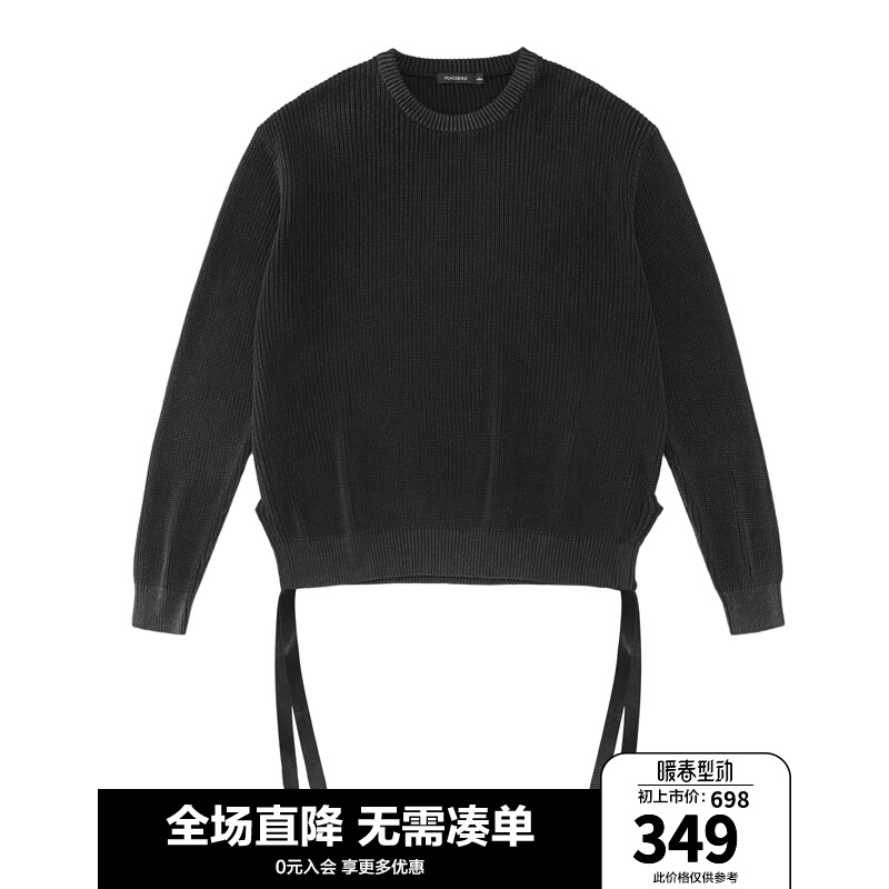 太平鸟男装 秋季新款纯色织带针织衫男宽松圆领毛衣毛衫潮 深灰 M