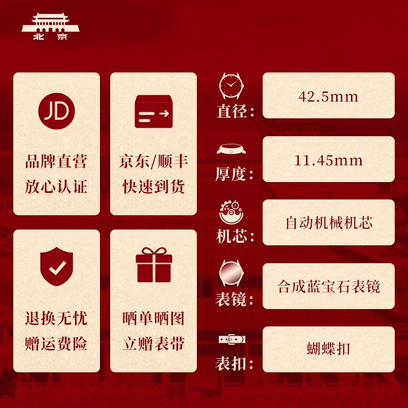 动力储备80小时,蓝宝石水晶玻璃表镜,防水深度50米。