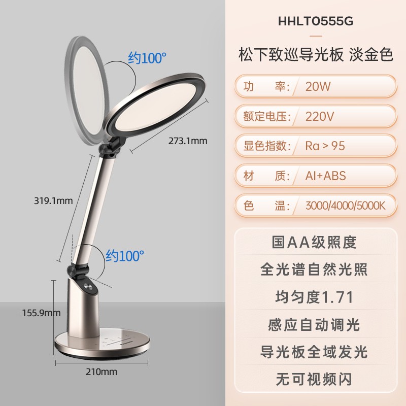 松下(Panasonic)台灯国AA级护眼台灯减蓝光LED灯工作阅读触控调光儿童学生学习台灯 导光板致巡系列金HHLT0655G