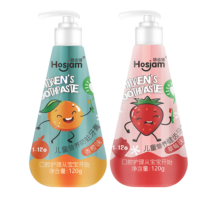 皓齿健1-12岁儿童牙膏套装240g水果味液体按压式(草莓+香橙)无氟防蛀