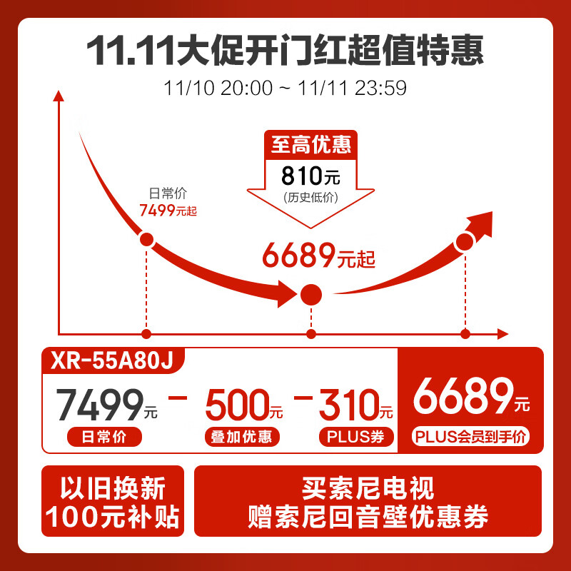 索尼(SONY) XR-55A80J 55英寸 4K高清HDR OLED全面屏电视 AI智能语音 小家智能生态 55英寸