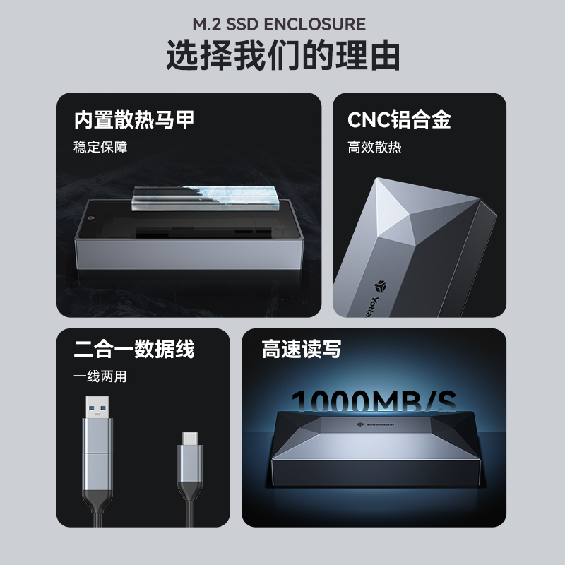 尤达大师 TR3-C3- M.2 Nvme移动硬盘盒内置散热马甲,采用铝合金材质高效散热,表面采用CNC精密切割+喷砂阳极氧化工艺。采用三明治结构,性能更出色,搭载高阶主控芯片。配备0.3m二合一全功能数据线,支持PD60W快充。支持4种尺寸SSD,容量至高支持4TB。 阅读全文 -