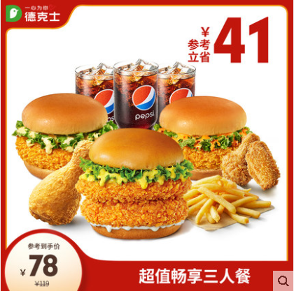 德克士 超值畅享三人餐 单次兑换券 炸鸡腿汉堡套餐 立省41元!
