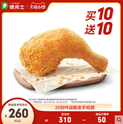 【618狂欢 买10送10共20份】德克士20份咔滋脆皮手枪腿多次兑换券 买10送10!