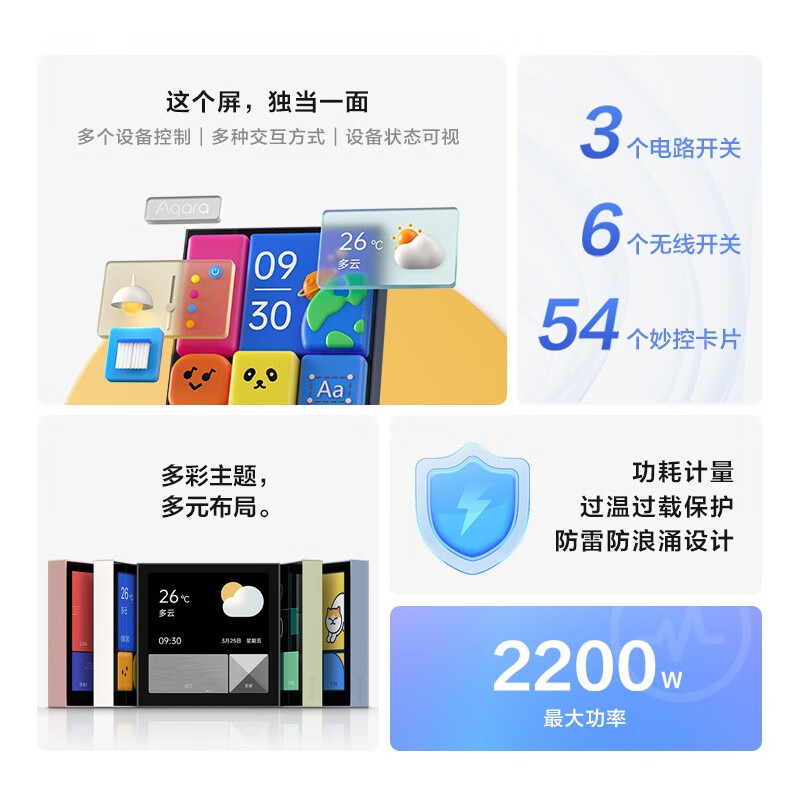全面屏开关,这个屏,独当一面。可进行多个设备控制,具有多种交互方式,设备状态可视。支持HomeKit生态,轻松接入,智能联动。借助六个无线开关,轻松联动,控制HomeKit中的场景与配件。 千人千面的妙控屏开关,无限拓展主题和布局样式。 可根据个人喜好和使用习惯,自定义妙控卡片的横竖与大小,并可放置在任意位置,打造出真正专属于你的个性体验。 支持语音控制:Siri、小爱同学、小乔、天猫精灵;场景,设备,天气,时钟,随心选,随心控支持。 智能开关前所未有的大胆尝试,跃动的色彩与趣味满满的颜文字巧妙结合,年轻就是这样个性十足。 如俄罗斯方块般的星罗棋布,搭配返璞归真的自然色彩,简约却不简单。 致敬毕加索的立体主义,在光影律动与几何线条之间,赋予全面屏独此一份的立体质感。 远比一般智能开关要强大的功能,一个屏幕就能轻松拿下。拥有一个妙控开关S1E,等于拥有:3个电路开关,6个无线开关,54个妙控卡片。 阅读全文 -