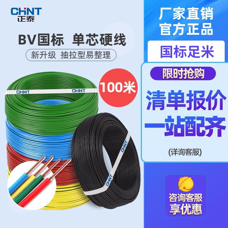 正泰(CHNT) 正泰(CHNT)电线电缆BV2.5平方 铜芯单芯单股国标电源线照明足米家装硬线 100米红色BV2.5